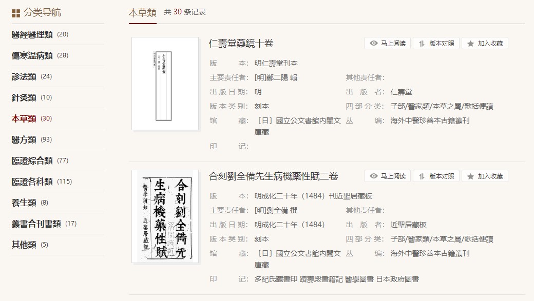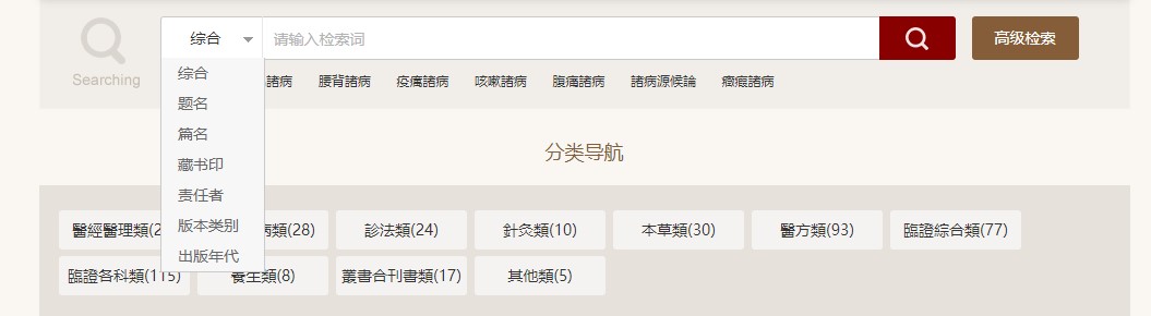 数据库根据资源分类,提供导航服务,针对特定领域资源提供专业导航,如中医古籍分类导航。