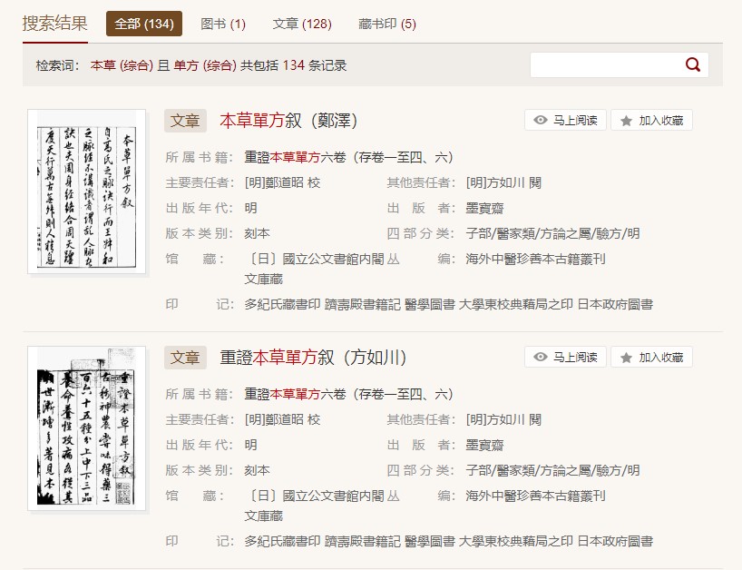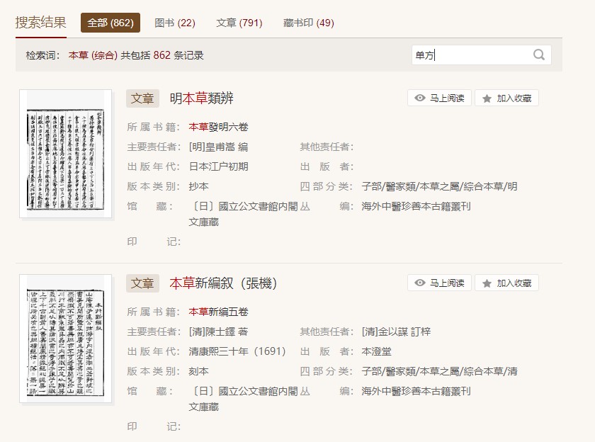 二次检索可在普通检索的基础上,基于上一次的检索范围,实现进一步复合检索。例如“本草”的普通检索结果内,检索“单方”: