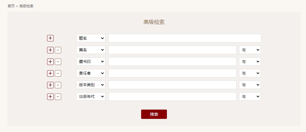 普通检索可选择按照综合、题名、篇名、藏书印、责任者、版本类别和出版年代不同维度进行检索;其中藏书印检索数据库的特色功能,基于对古籍上的藏书印的数字化标注和处理,实现藏书印检索,对用户理清古籍递藏源流有重要意义。同时,数据库支持支持繁简字和异体字检索。